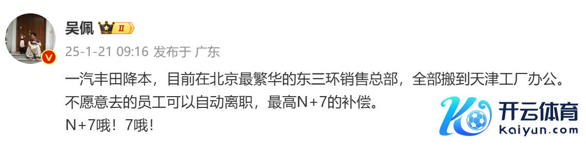 说明该博主的说法,一汽丰田将当今在北京最富贵的东三环销售总部一齐搬到天津工场办公。要是有不肯意去的职工不错自动下野,最高约略赢得N+7的补偿。其实早在客岁年底时,联系音问就已遭到曝光。而对于一汽丰田销售总部从北京搬到天津工场的音问,更是在几年前就已传出,通过几个月互助动员后,在客岁11月“认真决定”。诚然从北京到天津,坐高铁最快仅半个小时,关联词触及到社保、家庭及身分,一汽丰田的这一举动如故让一些北京职工选拔下野抵偿。