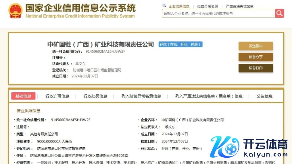 据国度企业信用信息公示系统泄漏,2024年12月7日九游体育app官网,中矿国链(广西)矿业科技有限包袱公司设置。具体信息如下: