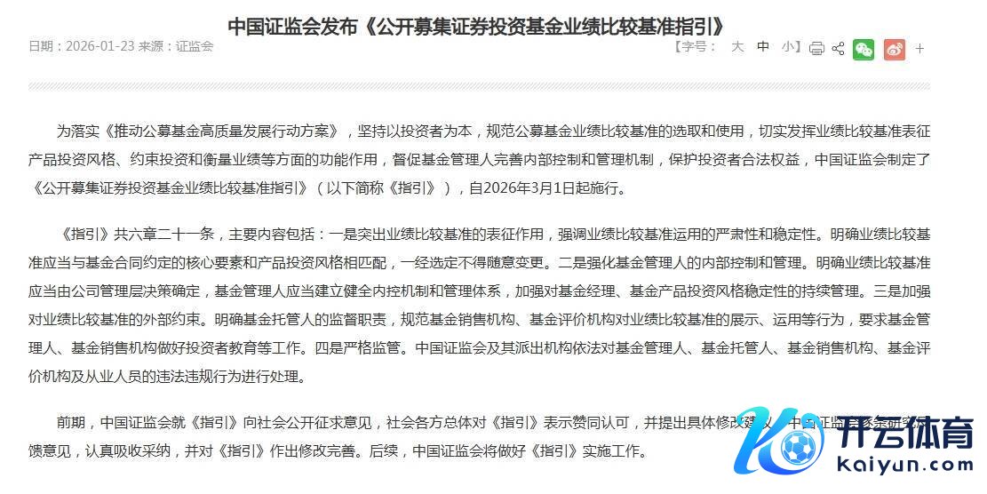 23日盘后,证监会发布《公开召募证券投资基金功绩相比基准开辟》,主要执行包括:一是杰出功绩相比基准的表征作用,强调功绩相比基准期骗的严肃性和巩固性。明确功绩相比基准应当与基金条约商定的中枢要素和家具投资立场相匹配,已经采选不得松驰变更。二是强化基金解决东谈主的里面贬抑妥协决。明确功绩相比基准应当由公司解决层决策确定,基金解决东谈主应当成立健全内控机制妥协决体系,加强对基金司理、基金家具投资立场巩固性的握续解决。三是加强对功绩相比基准的外部不绝。明确基金托管东谈主的监督职责,规范基金销售机构、基金评价机构对功绩相比基准的展示、期骗等步履,条款基金解决东谈主、基金销售机构作念好投资者教养等责任。四是严格监管。中国证监会过甚派出机构照章对基金解决东谈主、基金托管东谈主、基金销售机构、基金评价机构及从业东谈主员的犯科违纪步履进行处理。